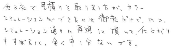 他3社で見積もりをとりましたが、カラーシミュレーションが出来たのは御社だけで、かつ、シミュレーション通りに再現して頂いて、仕上がりも素晴らしく、全く申し分ないです。