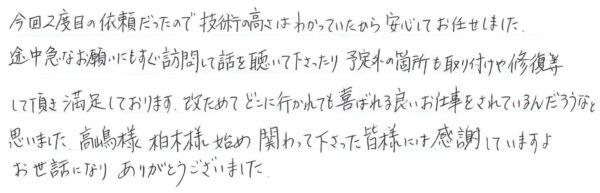 途中急なお願いにもすぐに訪問して話しを聴いて下さったり、予定外の箇所も取付や修復等して頂き満足しております。