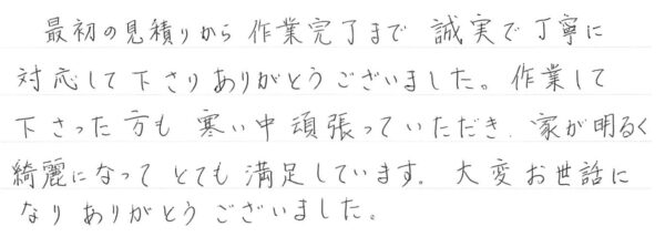 最初の見積もりから、作業完了まで、誠実で丁寧に対応して下さり、ありがとうございました。作業して下さった方も、寒い中頑張って頂き、家が明るく綺麗になってとても満足しています。大変お世話になりありがとうございました。