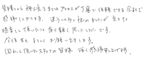 見積もりから、施工完了までの、プロセスが丁寧で信頼できる会社で感謝しております。