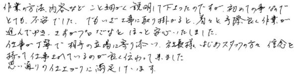 仕事が丁寧で、相手の立場に寄り添って、社長様はじめスタッフの方々、信念をもって仕事されているのが良く伝わって来ました。