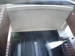 長年の汚れをしっかり落とすため、15MPaの高圧洗浄機を使用し、外壁も屋根も丁寧に洗い流していきます。