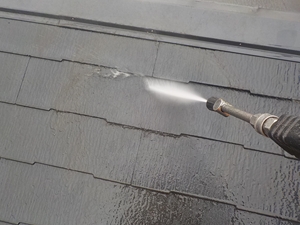 施工初日は、屋根と外壁の高圧水洗浄からスタート。