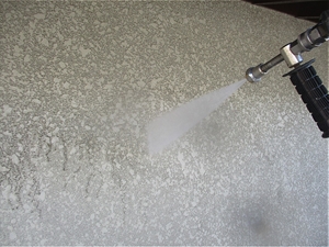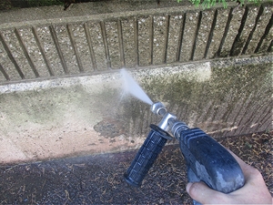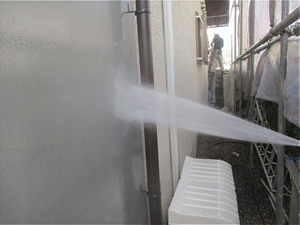 最初の工程は、高圧水洗。外壁にこびりついた汚れをしっかり落とす、大切な作業です。